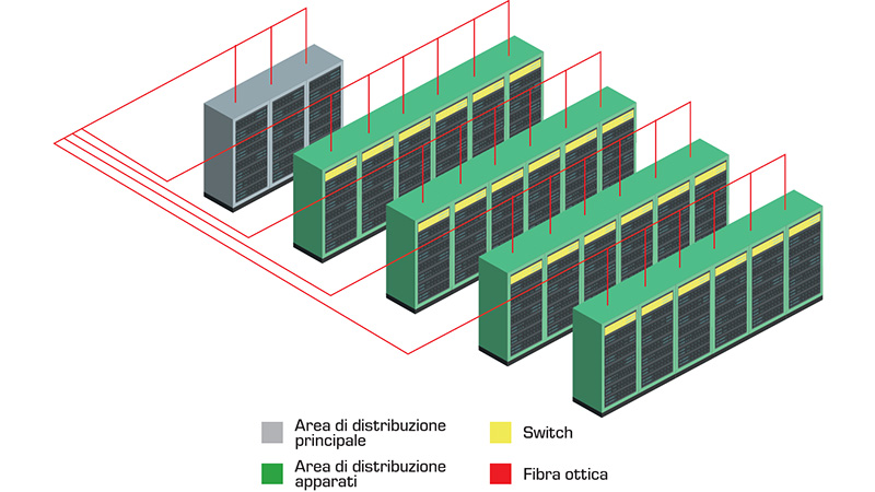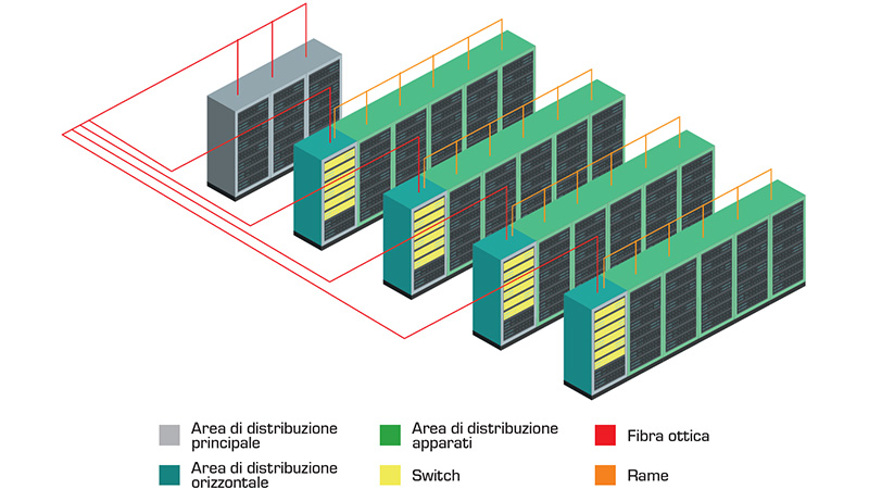 L’EoR (End of Row) centralizza gli switch di accesso in armadi alle estremità di una fila di rack. I server si collegano agli switch tramite cavi più lunghi, in rame o fibra.