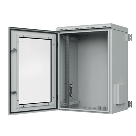 The range of IP55 wall-mounted cabinets, designed to meet specific installation requirements, especially in industrial environments, allows for the installation of structured cabling equipment and accessories in critical work environments. They are available in versions from 9 to 16U, with depths of 450 or 600 mm, blank front door, hinged roof that can be opened, cable entry holes at the bottom and provision for forced ventilation under the roof.