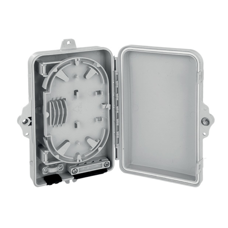 IP65 optical box with 8 empty positions for SC Simplex or LC Duplex connectors, suitable for both indoor and outdoor use, can be wall-mounted. It can be used for FTTH and FTTB systems, for cable-to-cable inline splices and for terminations using pigtails or connectors.
